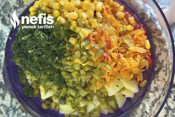- Patates, sotelenmiş sebzeler, mısır, turşu ve dereotunu birebir kaba ekleyin.