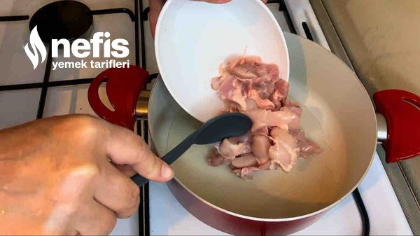 - Tenceremize yağı koyup kızdırdıktan sonra tavuk etini ekliyoruz. Yağ kızgın olsunki tavuk etleri sulanmasın, lezzeti içinde kalsın diye.