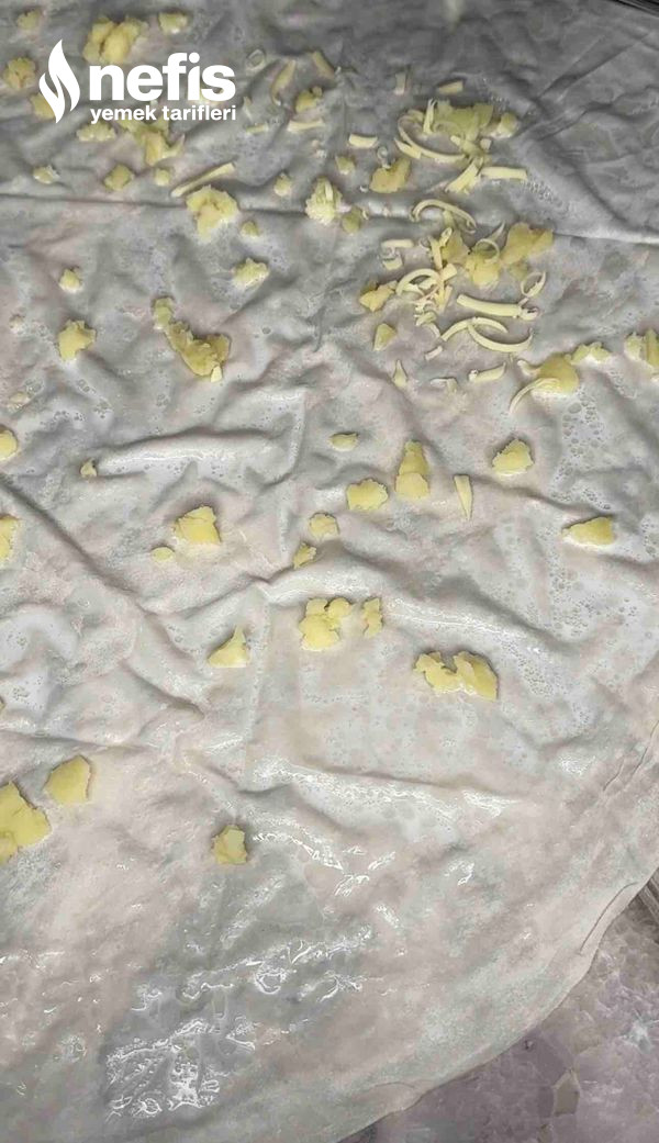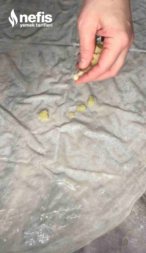 - 1 adet yufkayı seriyoruz içine sosunu sürüyoruz ve daha sonra patatesi ufalayarak koyuyoruz ve rendelenmiş kaşarı serpiyoruz.