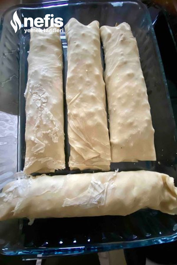 - Yufkanın dar olan kısmından başlayıp 2 parmak kalınlığında katlayıp rulo haline saralım fırın tepsisine koyup 1 ter santim kalınlığında kesip erimiş tereyağı üzerine güzelce döküyoruz.