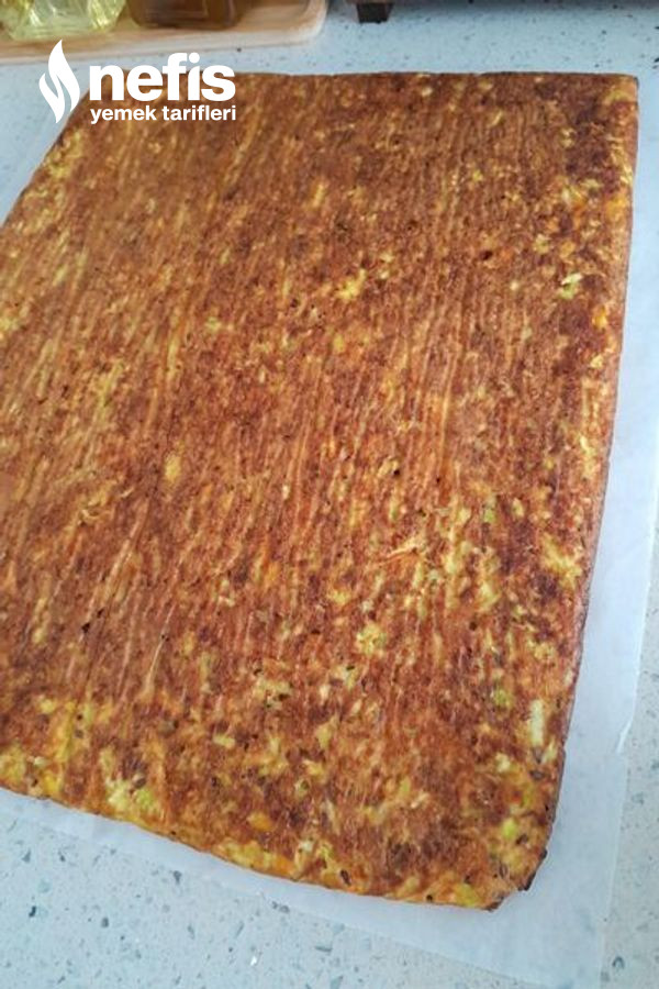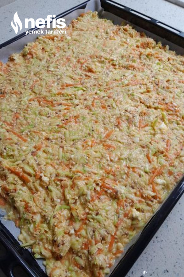 - Diğer gereçleri ekleyip karıştıralım ,tepsiye yağlı kağıt serelim onuda biraz yağlayıp ,harcı üzerine yayalım ,tekrar üzerine zeytinyağı gezdirelim.