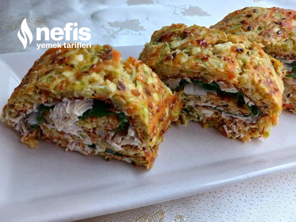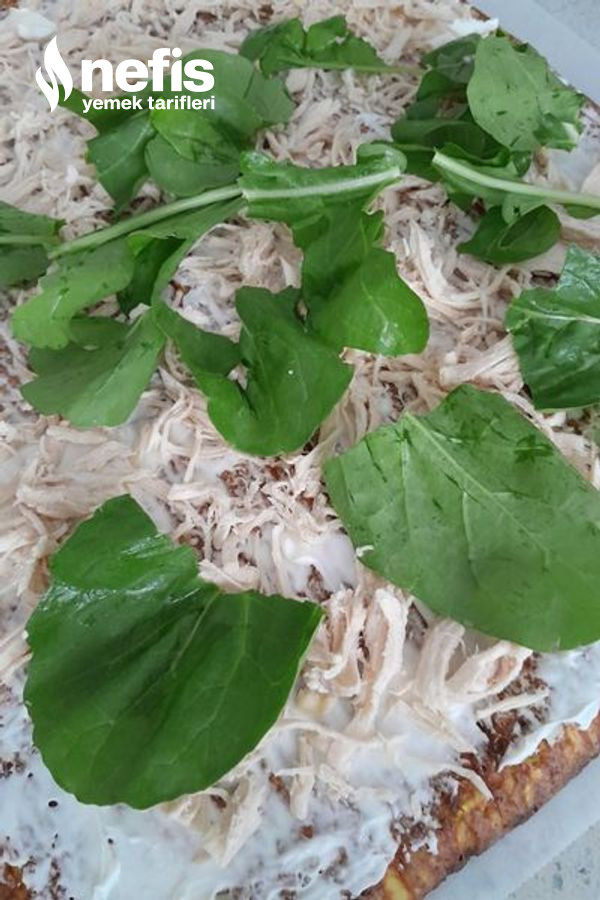 - Üstteki kağıdı çıkaralım, üzerine evvel labne peyniri sürelim, üzerine roka yapraklarını serpelim ,haşlanmış didiklenmiş tavuk göğsünü serpelim ,soğanı ince dilimleyip onlarıda üzerine serpelim, biraz tuz serpip limon suyu ekleyelim.