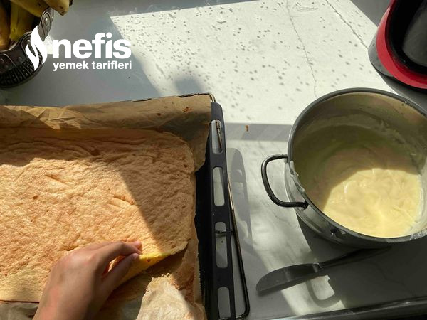 8. Soğuduktan sonra açıp kremayı sürüyoruz içine ben muz attım siz isterseniz çilekte damla çikolata da katabilirsiniz.