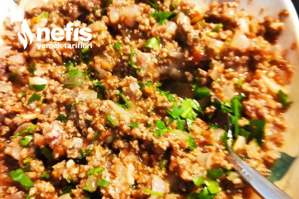 - Bu ortada soğan minicik yemeklik doğranır farklı bir tavada az yağla kavrulur kıyma ek edilir 1 adet çarliston biber ek edilir sarımsağı tuzu karabiberi atılır bir adet domates minik doğranıp ek edilir gereçler özleşene kadar 10 dakika kavrulur altı kapatılır.