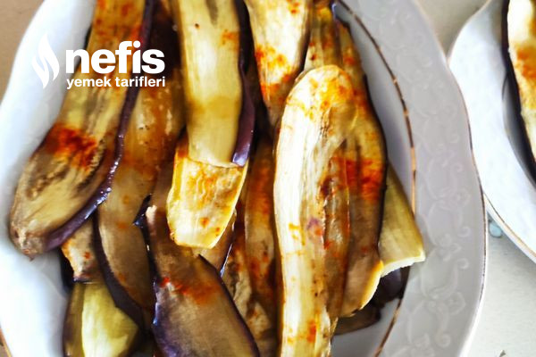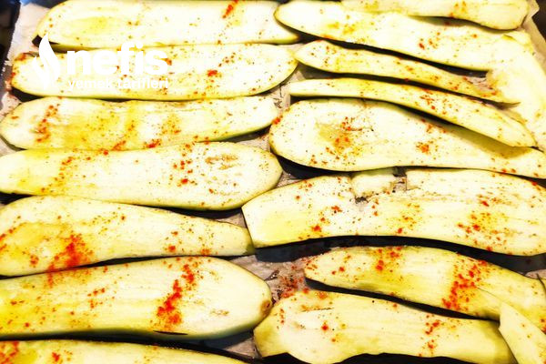 - Fırın tepsisine yağlı kağıt serilir üzerine fırça ile zeytinyağı sürülür, kurulanan patlıcanlar tepsiye dizilir.