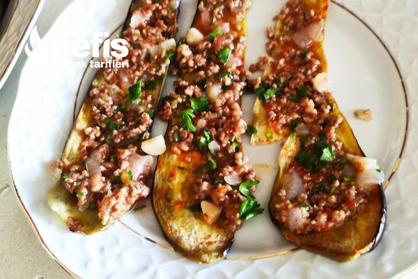 - Fırında kızaran patlıcanlar bir tabağa alınır üzerlerine kıymalı harçtan her yerine sürülür halinde kıvrılır kare borcama sırayla dizilir .
