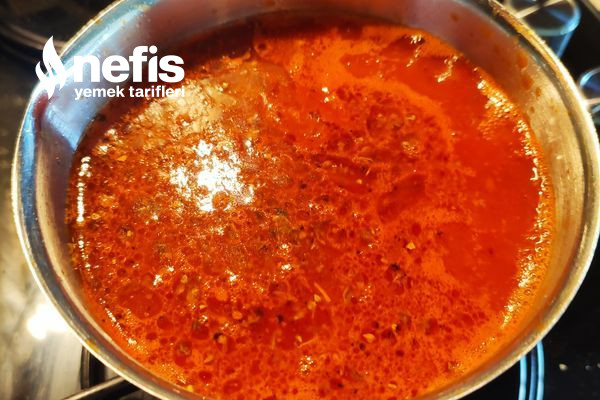 - Patlıcanlar bittiğinde farklı bir kapta kalan yağ ek edilir üzerine salça koyularak kavrulur daha sonra domates püresi ya da 2 adet domates rendelenerek ilave edilir gereçler kaynamaya başlayınca üzerine 2 su bardağı sıcak su ek edilir karabiber ve tuz desteği yapılarak 5 dakika kaynatılır.