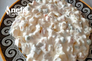 - Süzülüp soğuyan sebzeler ve küp biçiminde doğranmış kornişon turşu yoğurtlu karışıma dökülür.