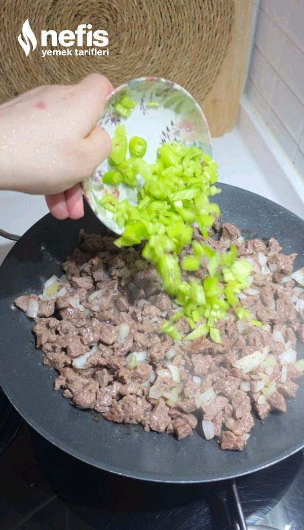 - Soğanları ekliyoruz. Biraz kavurduktan sonra yeşil biberi ekliyoruz.