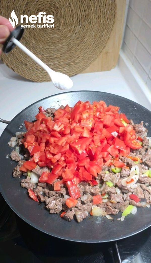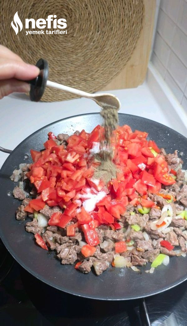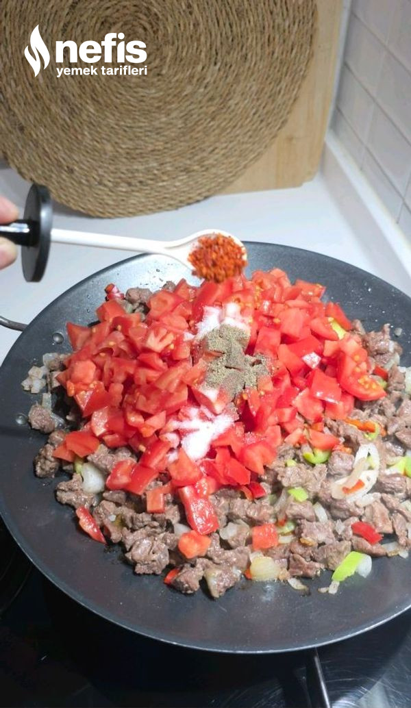 - Domatesleri ve baharatları ekleyip kapağını kapatıyoruz. Etler yumuşayıncaya kadar pişiriyoruz.