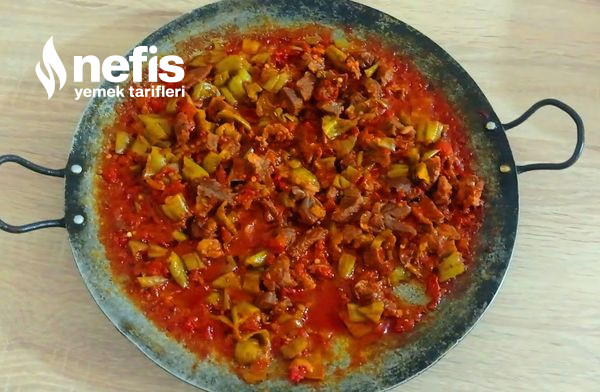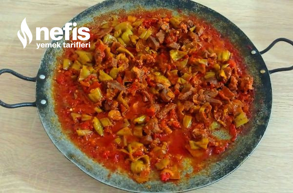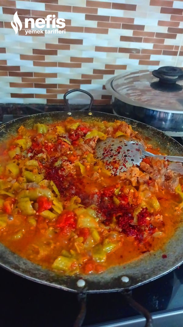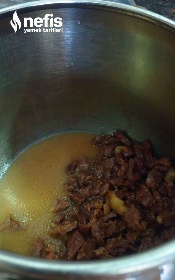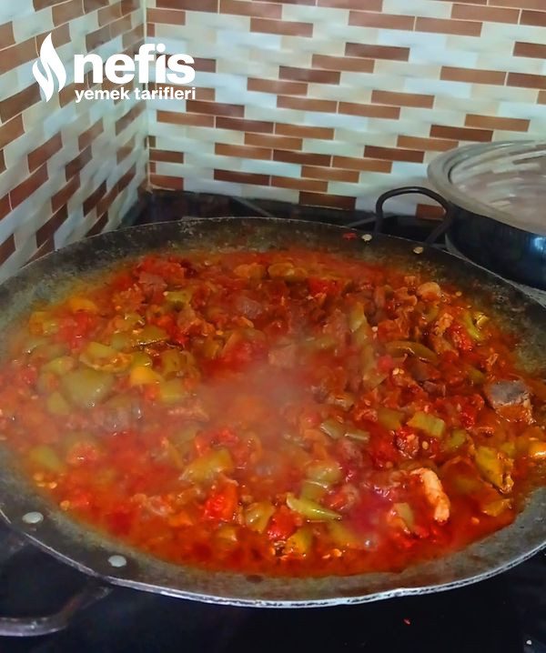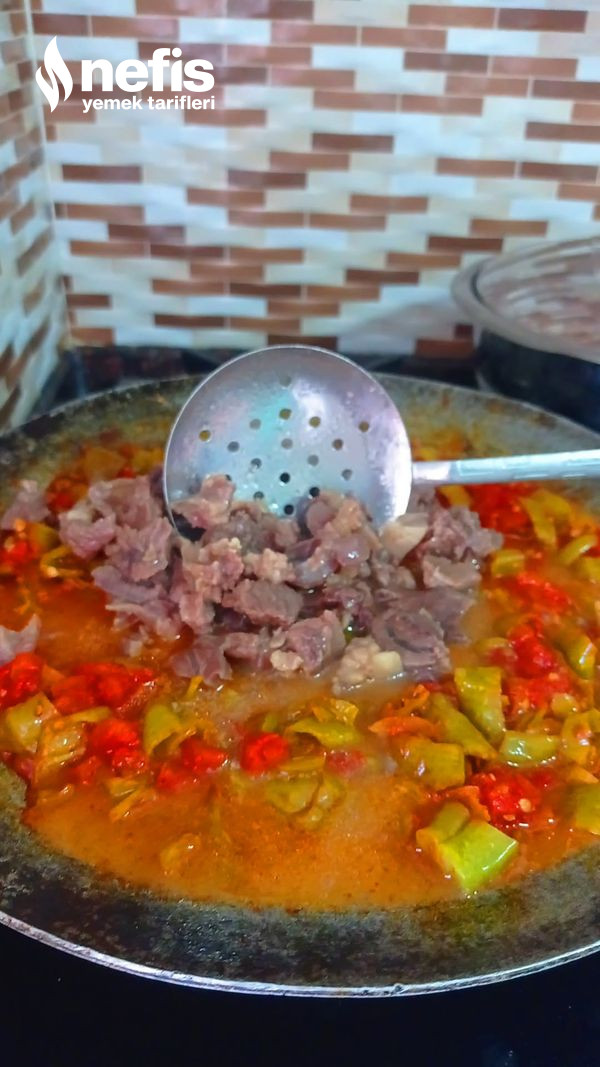 - Diğer yandan düdüklü tencerede pişen etimizi suyu ile birlikte saç da pişen sebzelerimizin üzerine ekleyelim ve karıştıralım bu biçimde 10 dakikada daha pişirelim daha sonra servise hazır.