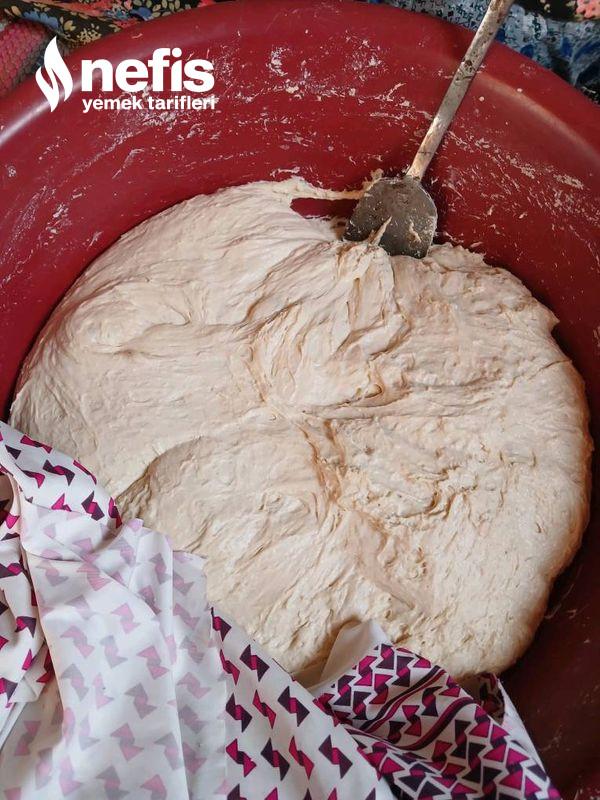 - İlk evvel unumuzu leğenimizi eliyoruz daha sonra tuzunu mayasını ek ediyoruz ılık suyumuzu yavaş yavaş ekleyerek hamurumuzu yoğuruyoruz. Ele yapışmayacak kıvamda olana kadar yoğuruyoruz.