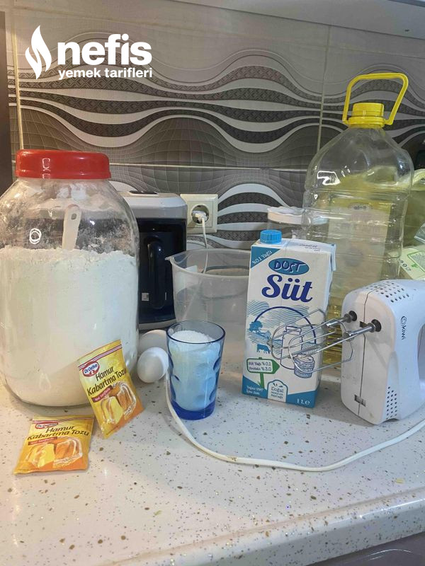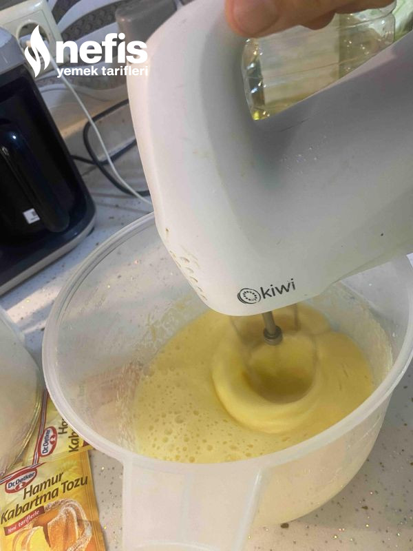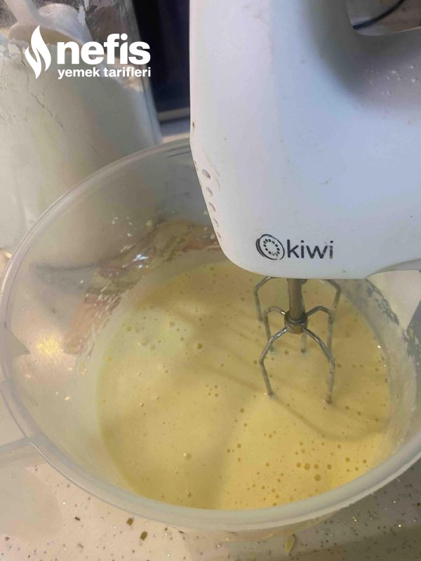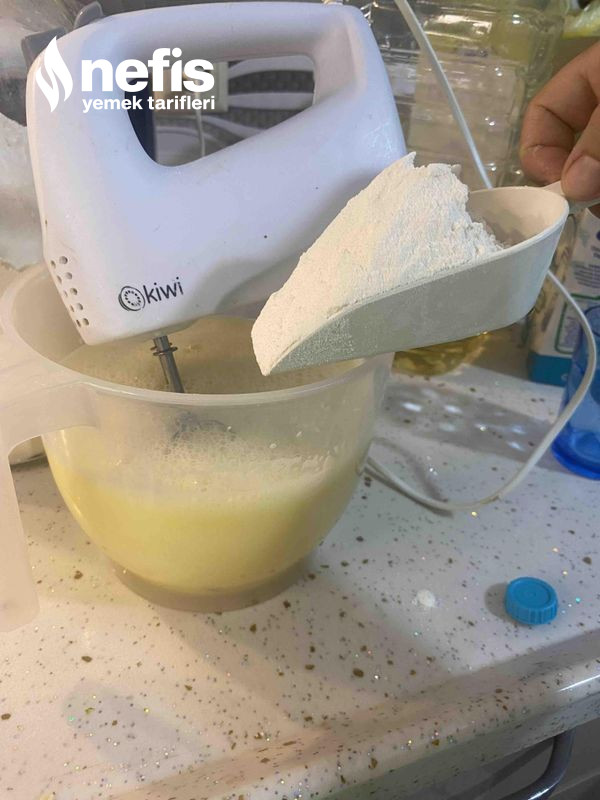 - Üzerine 1 su bardağından biraz eksik süt ve sıvı yağı koyup çırpmaya devam edelim.