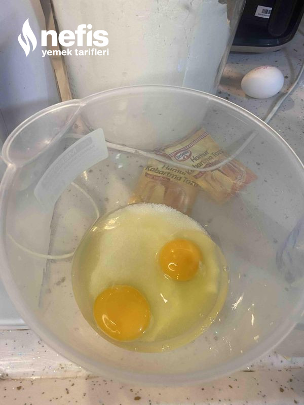 - Çırpma kabına 2 yumurta ve şekeri alalım köpük köpük olup beyaz oluncaya kadar çırpalım.