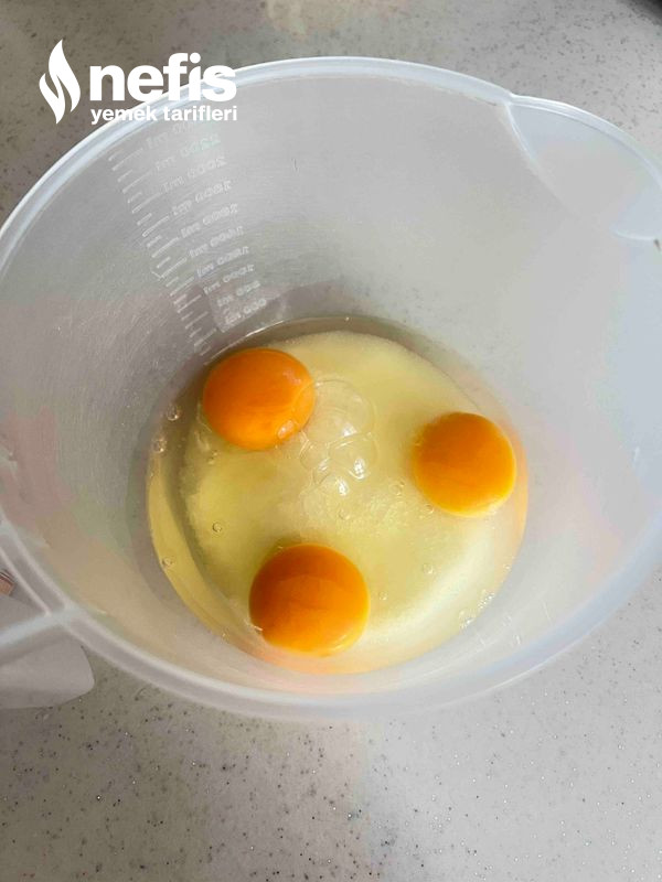 - Yumurtlar ve şeker mixer ile 5 dk çırpılacak.