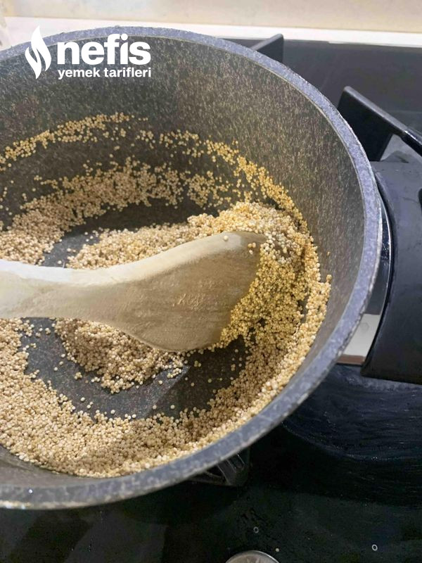 1. Sıvı sağ ve sadeyağı ısıtıp kinoayı kavuruyoruz.