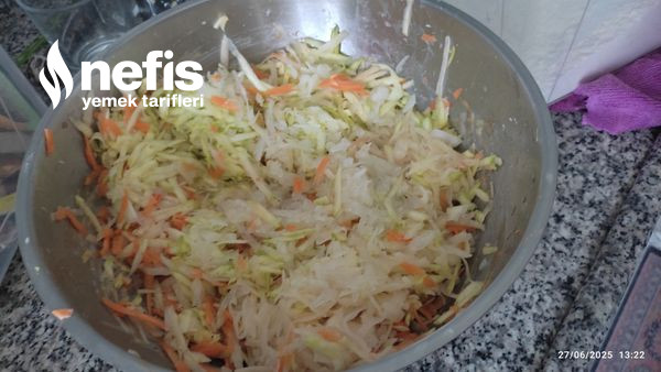 1. Sırayla zerzevatları derin bir kaseye rendeliyoruz.