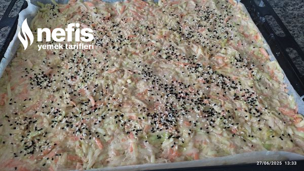 3. Fırın tepsisine yağlı kağıt serip hafif yağlayıp karışımı yayıyoruz.
