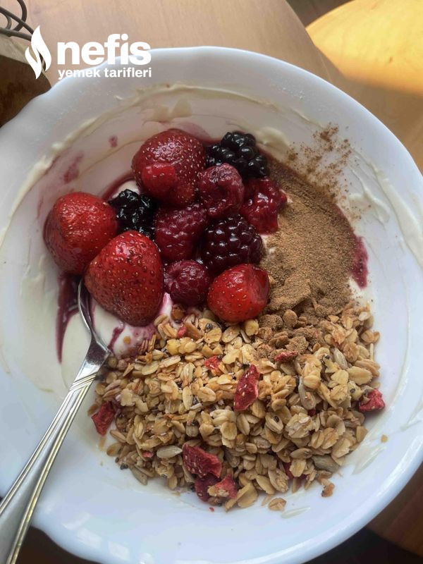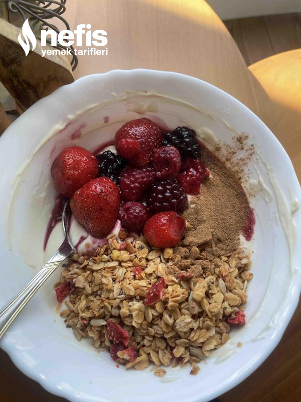 - Karışımın üstüne tarçın serpelim, meyvelerle süsleyelim, 2 yemek kaşığı granola ekleyelim. Sağlıklı tatlımız hazır☺️💐.