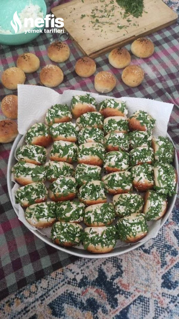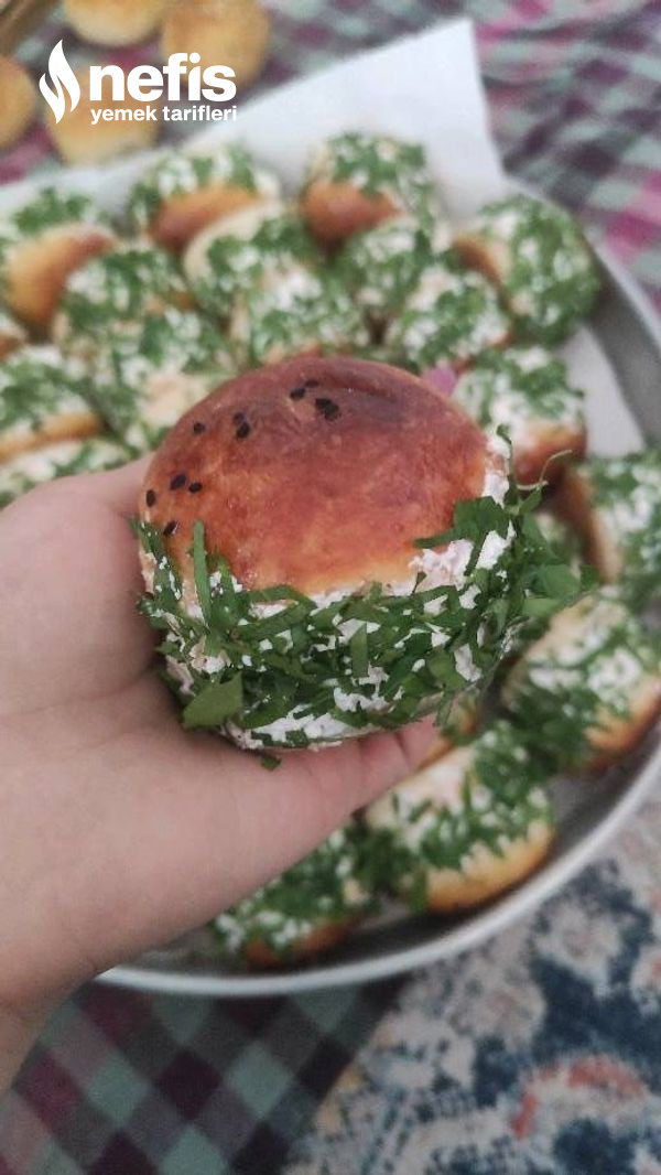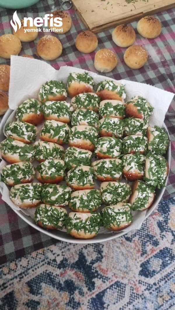 3. Biraz soğutulduktan sonra lor peyniri ve labne peyniri hafif tuz eklenerek karıştırılır ve poğaçaların bir kısmında açılan kesiğe sürülür. Daha sonra ince ince doğranan maydanoza bulanır.