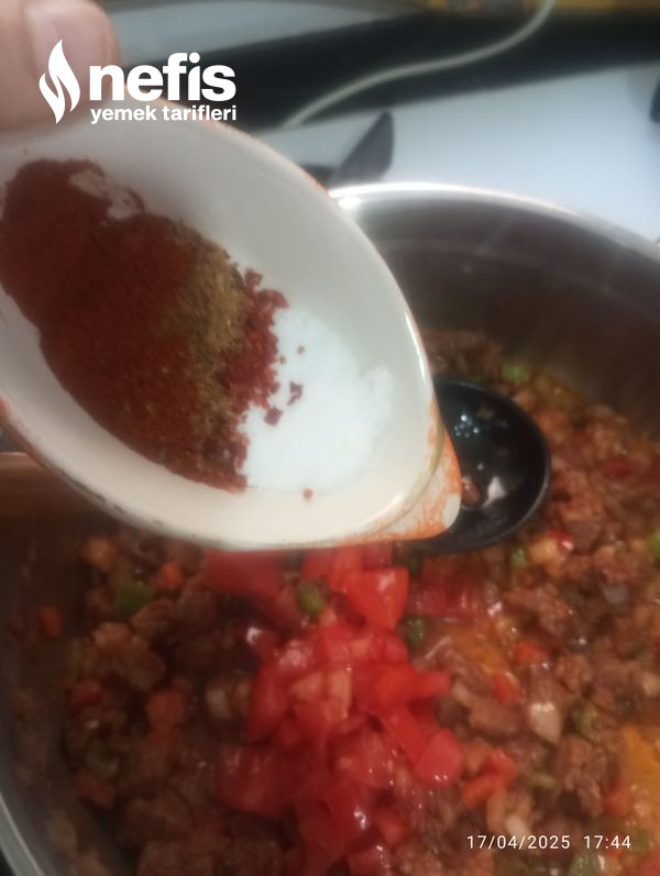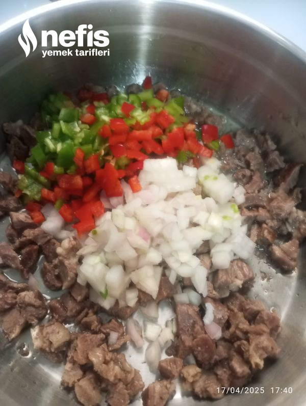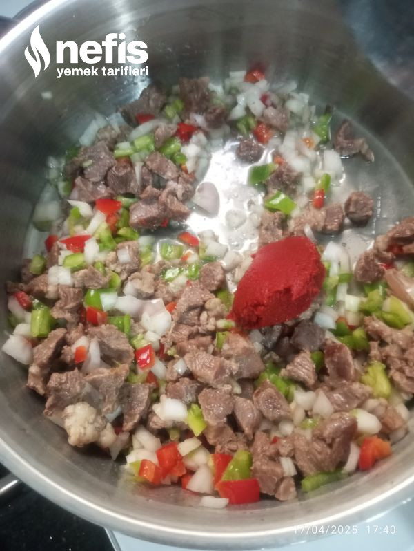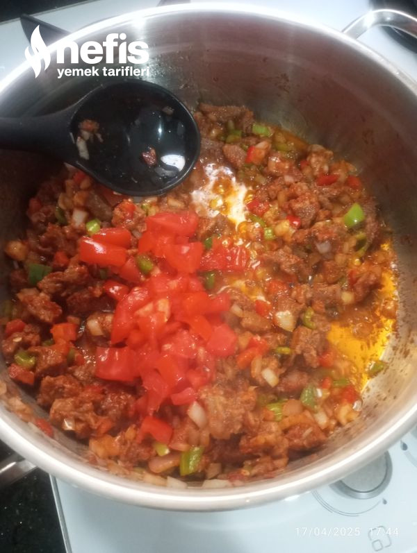 - Biraz karıştırıp biberleri ekliyoruz ,salçayı koyup karıştırıyoruz, sonra domatesleri ve baharatları ekliyoruz ,biraz bekledikten sonra bir bardak su koyup pişiriyoruz etimiz suyunu çekince ocaktan alıyoruz.
