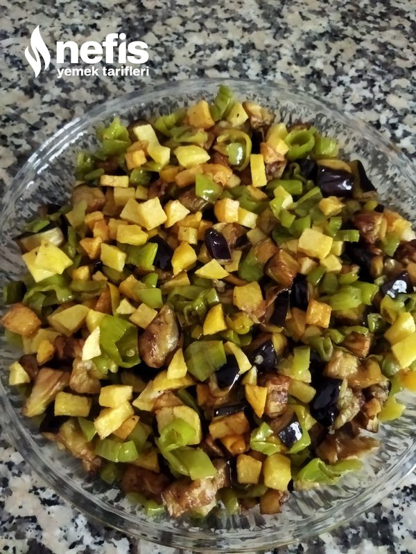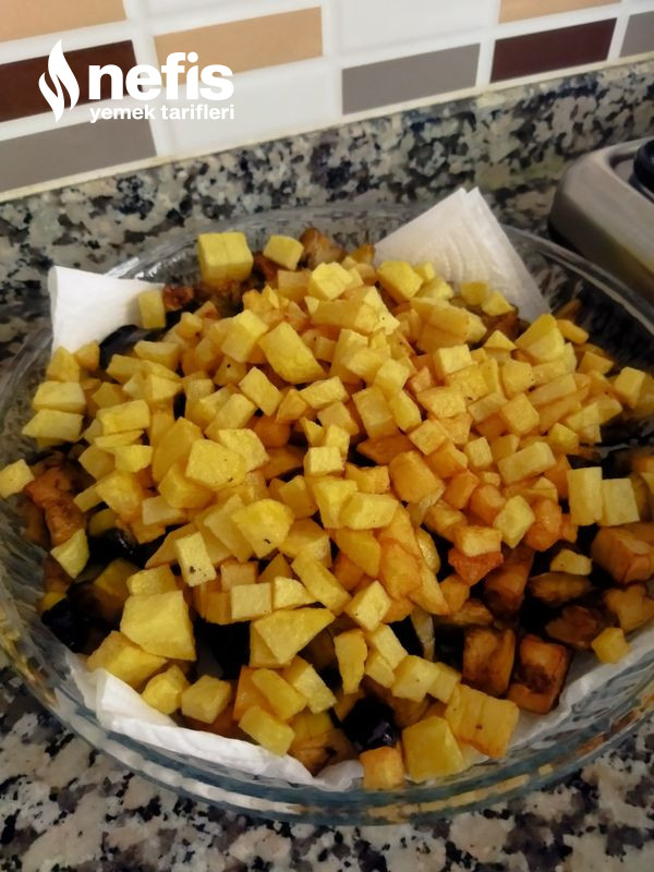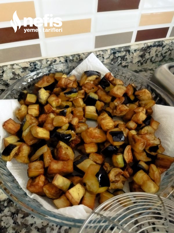 - Öncelik patlıcanlar soyulur doğranır küp küp tuzlu suda bekletip kağıt havlu ile suyunu alınca kızartma tenceresinde kızartılır.