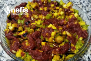 - Sos hazır olduktan sonra kızartma servis tabağına alınır karıştırılır ve sos üzerine sıcak iken dökülüp yayılır.