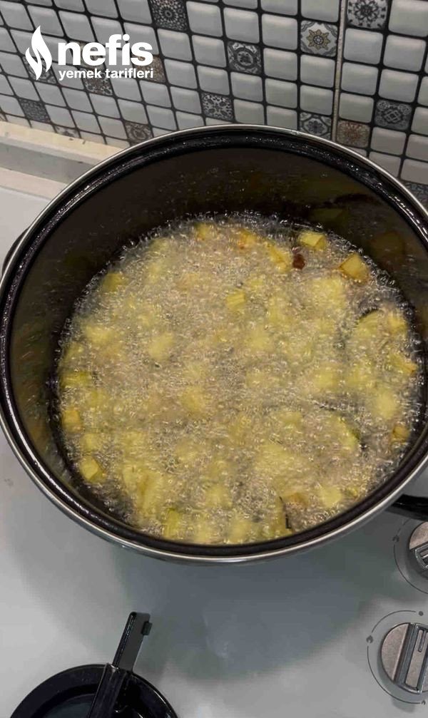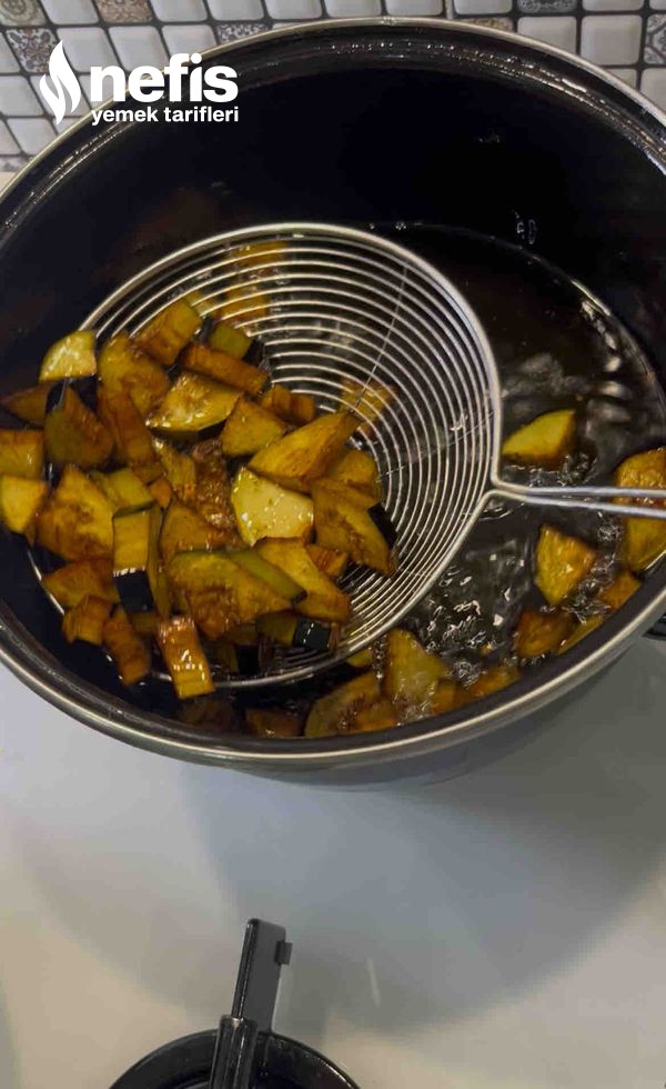 - Patlıcanları alacalı soyup orta büyüklükte doğruyoruz. Tuzlu suda acısını çıkardıktan sonra kurulayıp kızgın yağda kızartıyoruz.