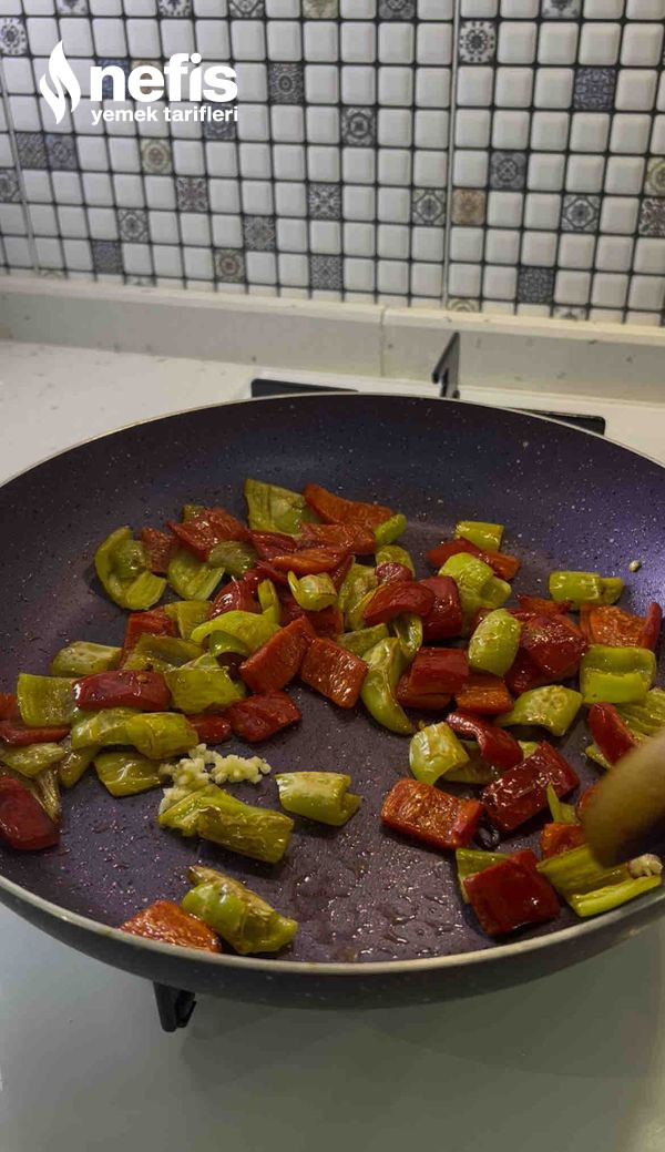 - Kavrulmasına yakın 2 diş sarımsağı ezip biberlerle birlikte 2-3 dakika daha kavuruyoruz.