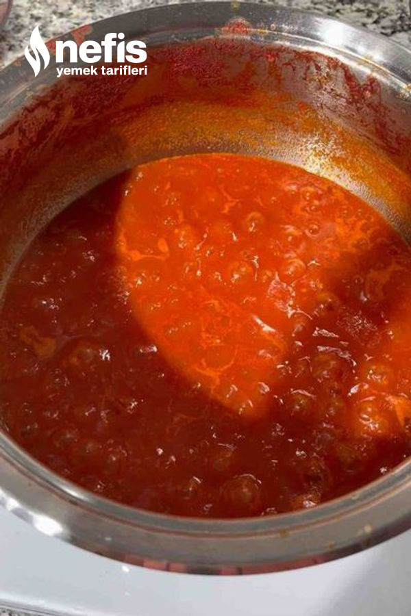 4. Domateslerin içine sıvı yağını ekleyip hafif yoğunlaşmaya başladığında kızarttığımız malzemeleride ekleyelim.