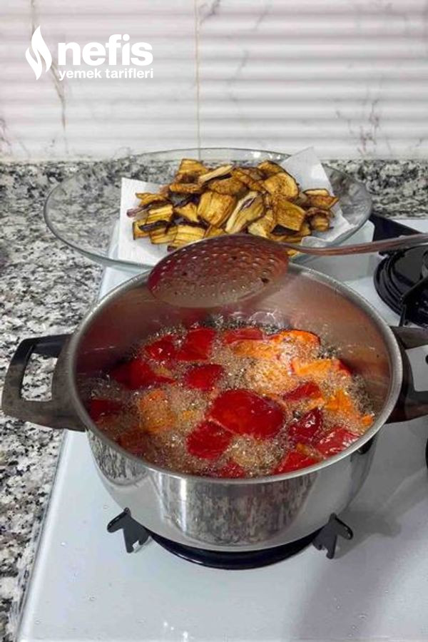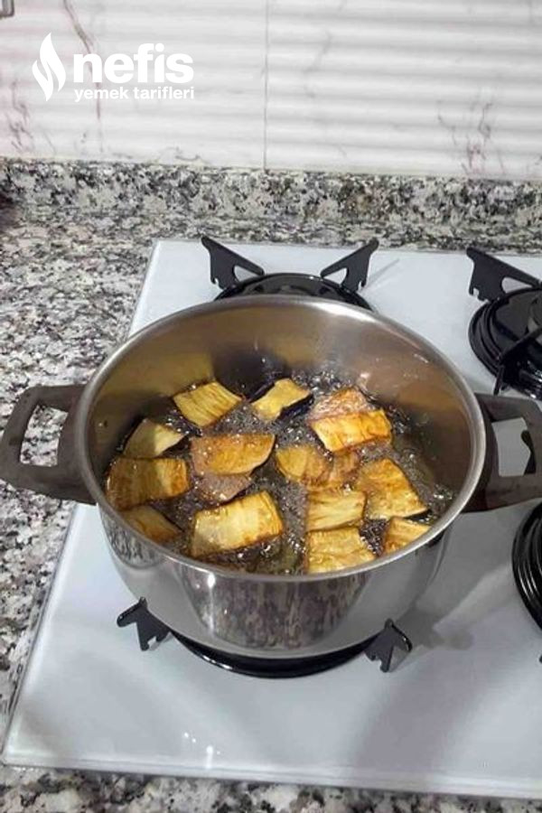 2. Patlıcanları soyup kare ve ince bir halde keselim ve kızartalım kapya biber ve biberi de dilimleyip kızartalım.