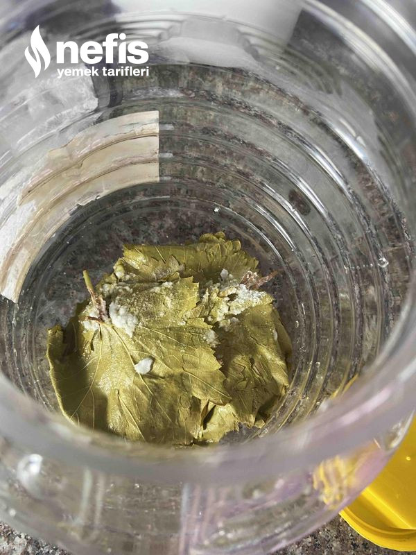 - Su soğuduktan sonra üst üste dizmiş olduğumuz yaprakların sap kısımlarını tuzluyoruz ve 5 lt bidona yerleştiriyoruz bitene kadar bu süreci yapınca kabın içindeki suyumuzu bidona boşaltıyoruz ve yarım kg daha tuz ekliyoruz.