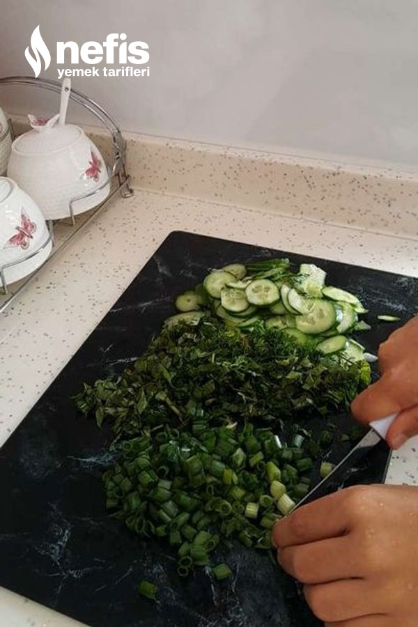 1. Salatalıkları ince yuvarlak doğrayın. Akabinde öbür yeşillikleri de doğrayın ve bir kaba aktarın.