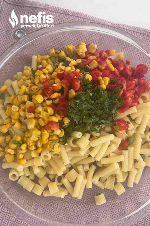 - Kapya biberi ,maydanoz ve dereotunu ince doğrayın ,konserve mısır ve bezelyeyi yıkayıp makarnaya ekleyin.