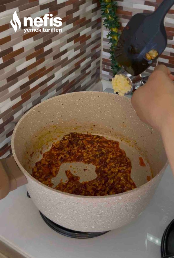 3. 2 diş sarımsağı ekleyip 2-3 dakika daha kavurmaya devam edelim.
