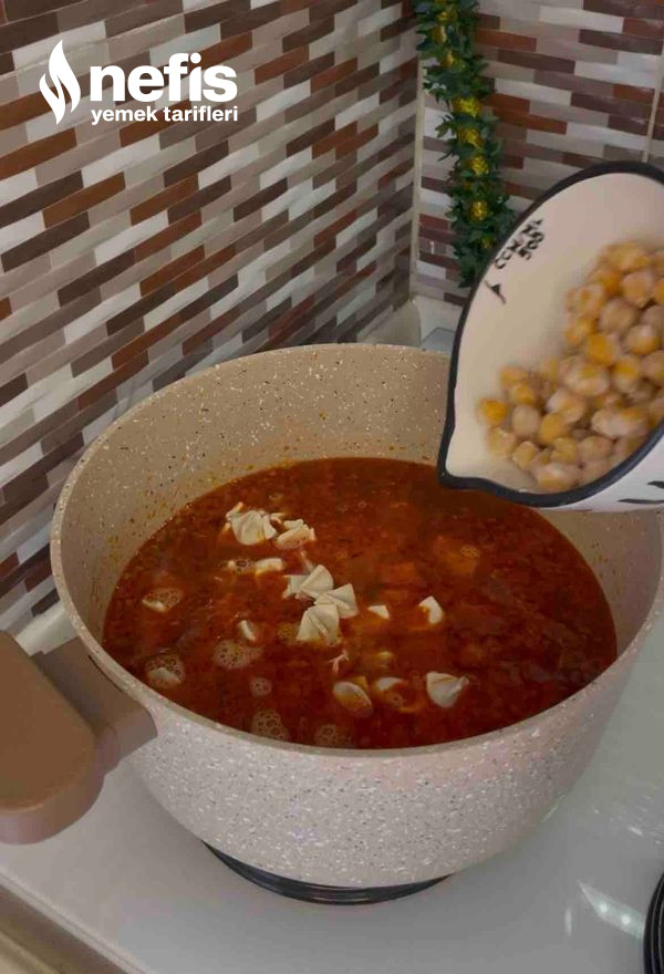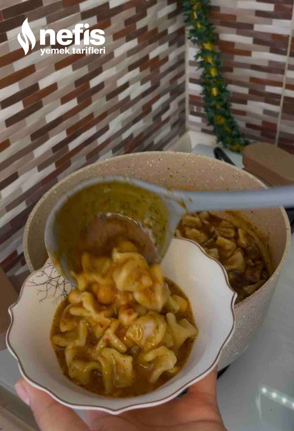 4. 5-6 su bardağı sıcak su, 1 su bardağı haşlanmış nohut, 2 su bardağı hazır mantı ekleyip tuzunu atıp mantılar yumuşayana kadar pişirelim.