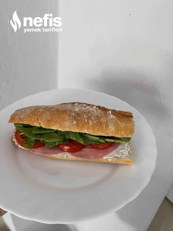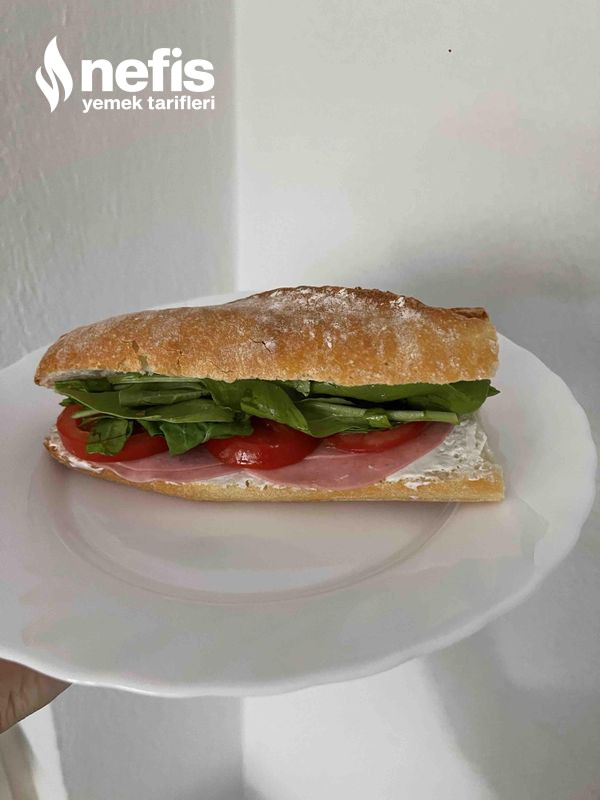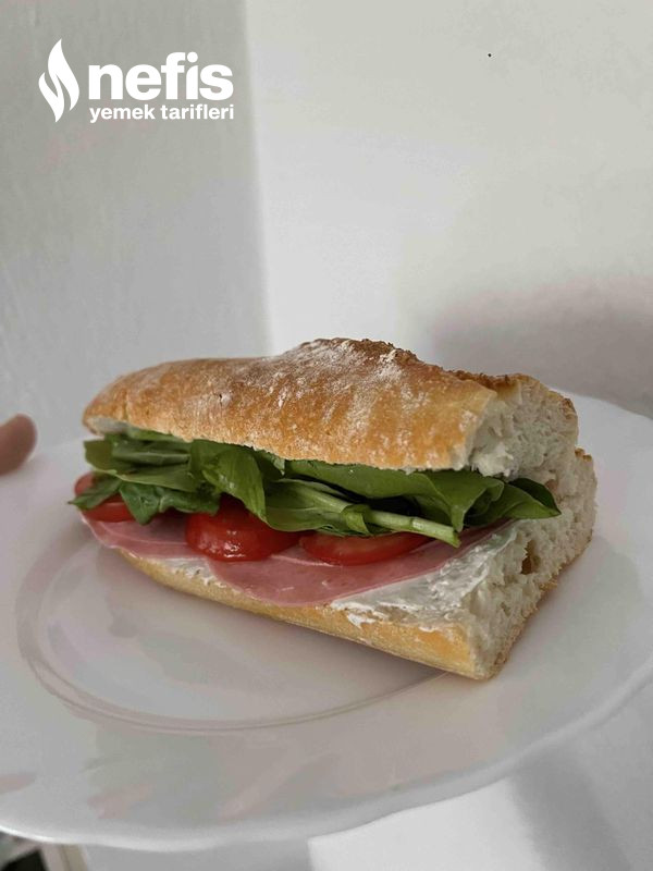1. Baget ekmeği 3’e bölelim ortasını bıçak ile keselim. Labne sürelim, domates, salam ve rokayı ekleyelim. Sandviçimiz hazır afiyet olsun 🥰