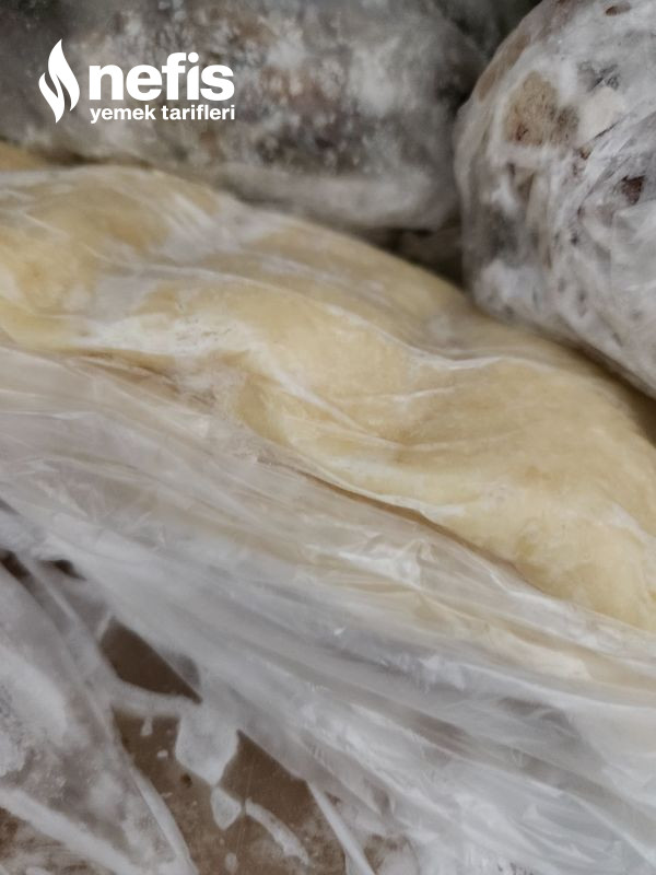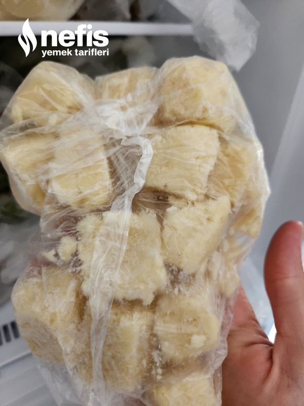 7. Ben bir kısmını saklama kabına öbür bir kısmını ise buzdolabı poşetine koydum buzdolabı poşetine koyacaksanız evvel hepsini koyup sonra elinizle ortalarını açıp küp küp hale getirmeniz gerekiyor yoksa birbirine yapışır.