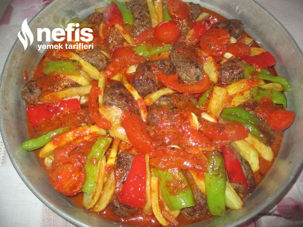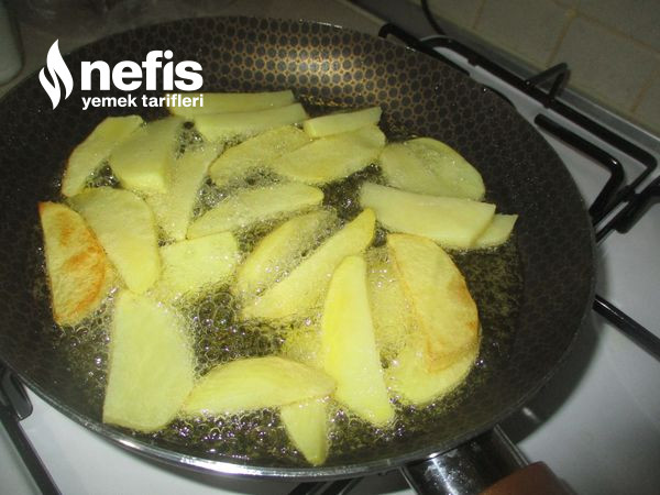 3. Tavaya sıvı yağ koyalım. Patatesleri ve biberler kızgın yağa koyalım. Çok az kızartalım kağıt havlu serilmiş tabağa koyalım. Köfteleride çok az kızartalım kağıt havlu serilmiş tabağa alalım.