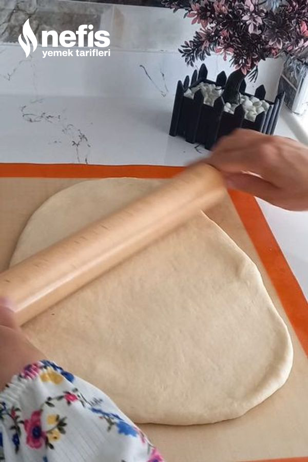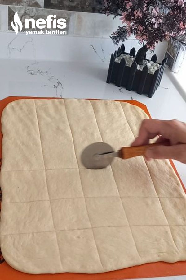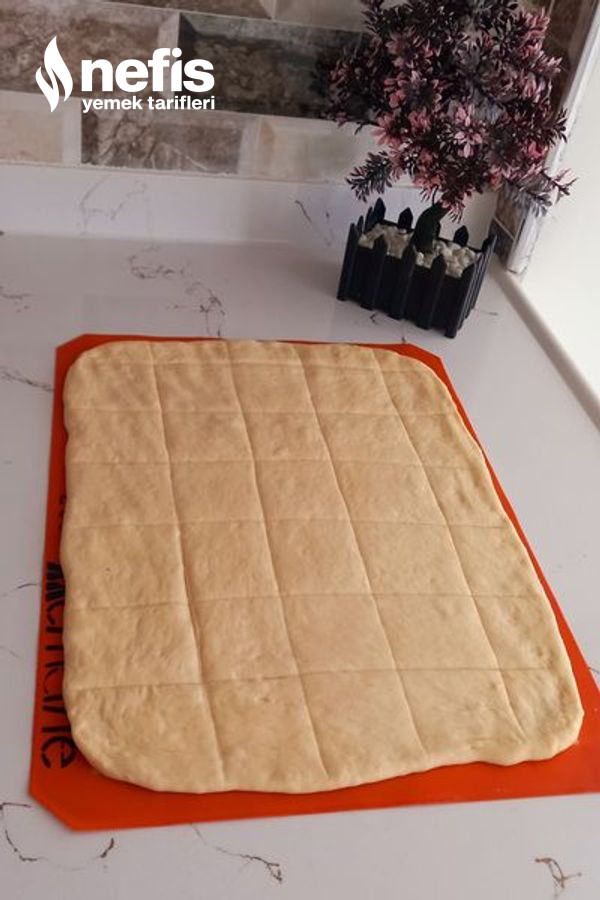 2. Mayası gelen hamurumuzun havasini alalım. Tezgaha yağlı kağıt serelim merdane yardımıyla ve elimizle dikdörtgen halde açalım. Hamuru tam kesmeden kare olacak biçimde kesikler atalım.