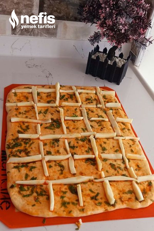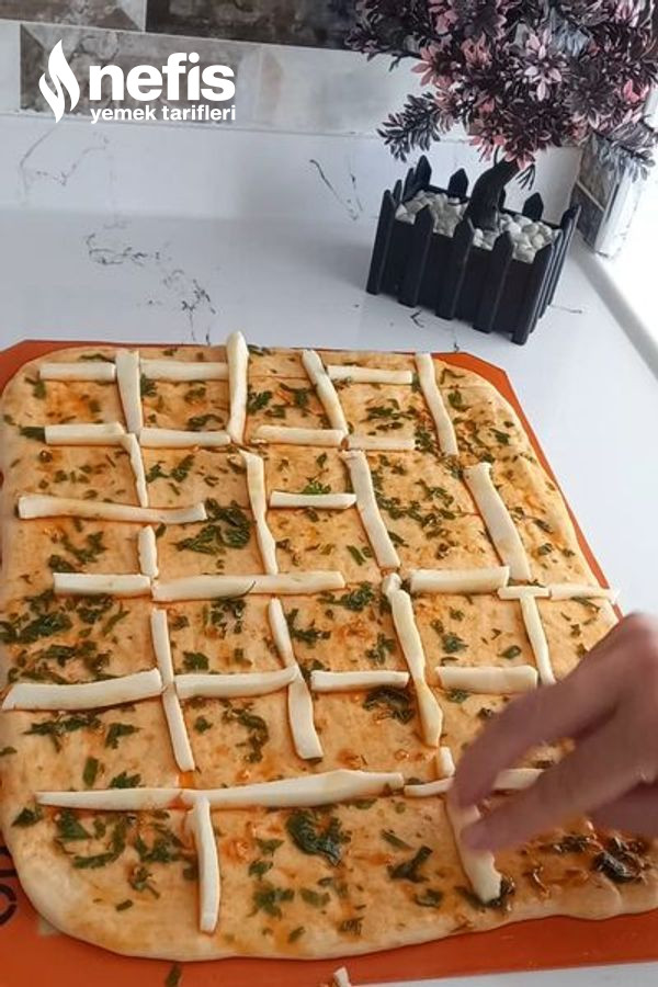 3. Sos için; gerekli gereçleri karıştırıp hamurun her yerine gelecek biçimde firça ile sürelim. Kesik olan yerlerede şeritler halinde kesilmiş kaşar peyniri koyalım.