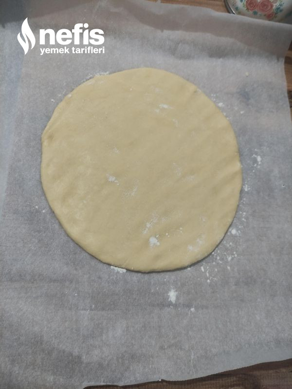 3. Hazır olan hamuru yağlı kağıt serilmiş tepside elimizde bir parmak kalınlığında açalım ve üzerine poşet örtüp yaklaşık 1 saat mayalandıralım.