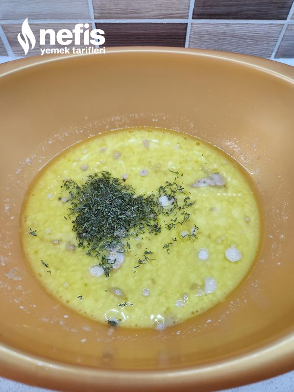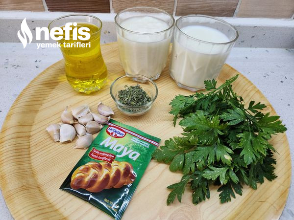2. Süt, yoğurt, zeytinyağı, ince rendelenmiş sarımsak ve kekik de ek edilerek düzgünce karıştırılır.