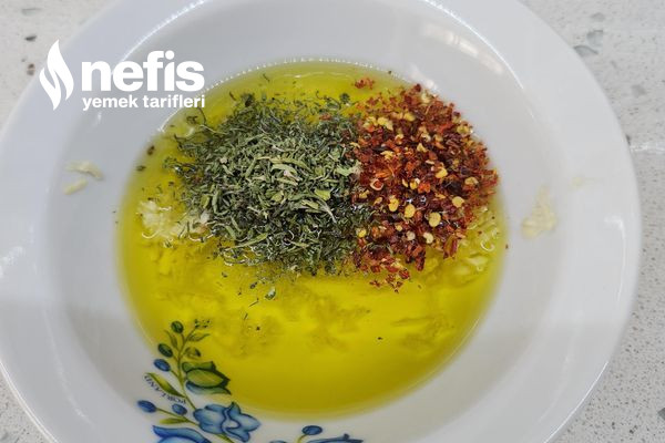 7. Zeytinyağ, pul biber, kekik ve tuz ek edililerek karıştırılır.