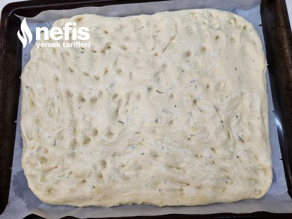 5. Mayalanan hamur yağlı kağıt serilmiş fırın tepsisine alınır. Elimizle bastırarak hamur tepsi büyüklüğünde açılır.