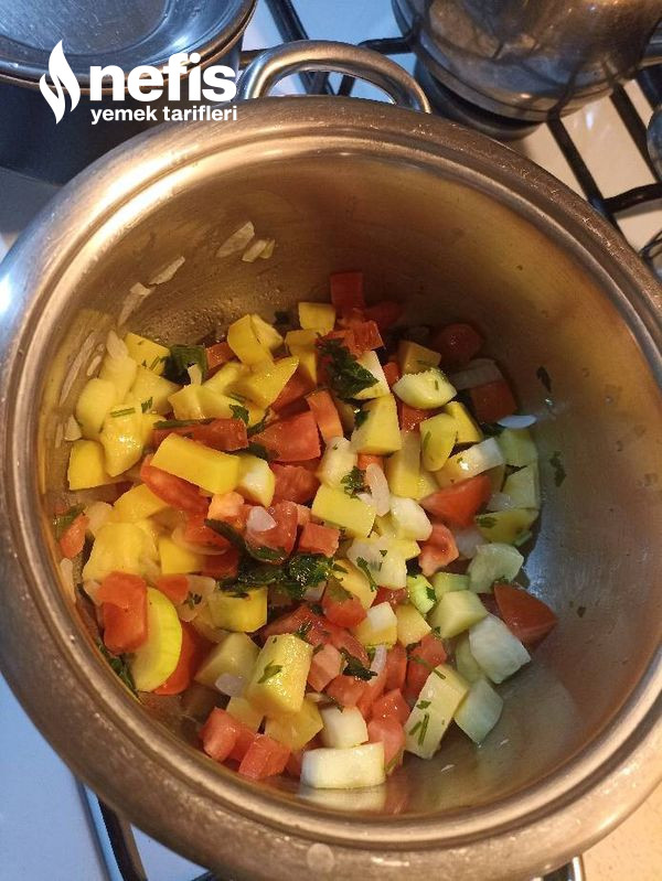 - Daha sonra bir tencerede evvel soğan, sonra kabak, sonra patates ,sonra domates ve en son maydanoz eklenerek düzgünce kavrulur.