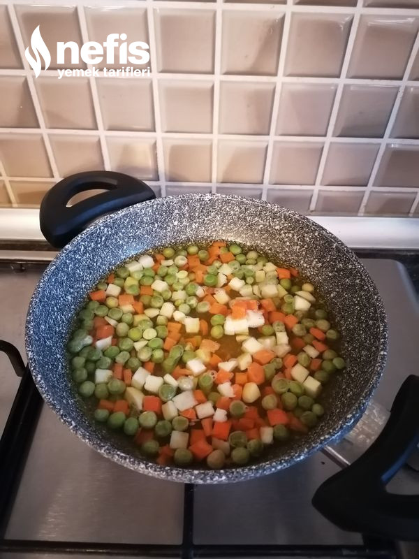 1. Dondurulmuş garnitürün buzu çözülüp, 1, 5 çay bardağı sıcak su ve 1 kaşık sıvı yağ ile 10 dakika haşlanır.