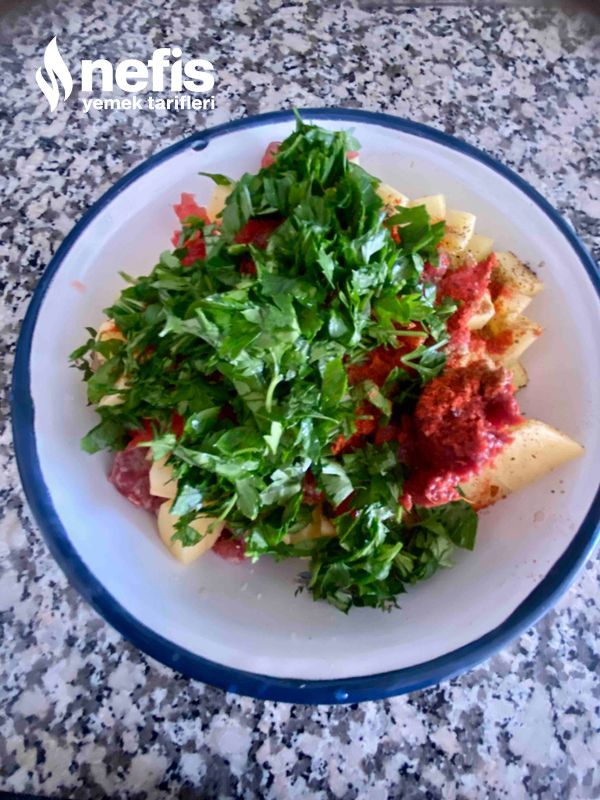 2. Tuz, baharat ,sıvı yağı ekleyip karıştırıyoruz ,ben airfray da kızarttım sİz fırındada yapabilirsiniz altı üstü kızarana kadar pişirirsiniz dilimliyoruz servis yapıyoruz.