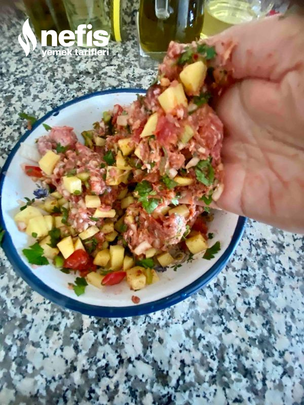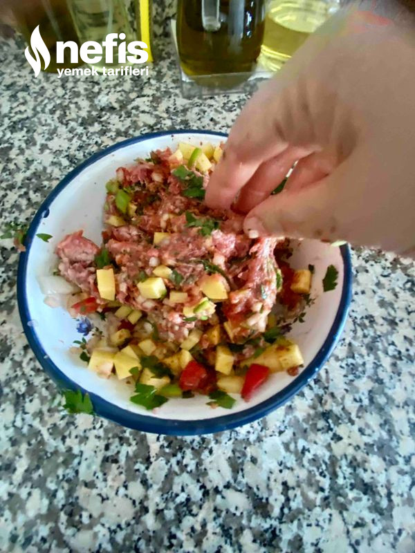 1. Kıymayı karıştırma kabına alıyorum ,üzerine ince kıyılmış soğan ,kıyılmış biber küçük küp küp doğranmış, patates ,kıyılmış maydanozu ekliyoruz .