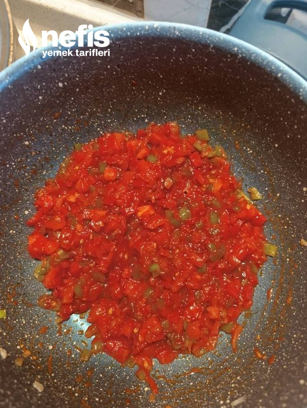 - Domateslerin üzerine salçayı ekleyelim (bu esnada 3/4 yemek kaşığı sıcak su ekleyerek salçayı düzgünce açıp karıştıralım).
